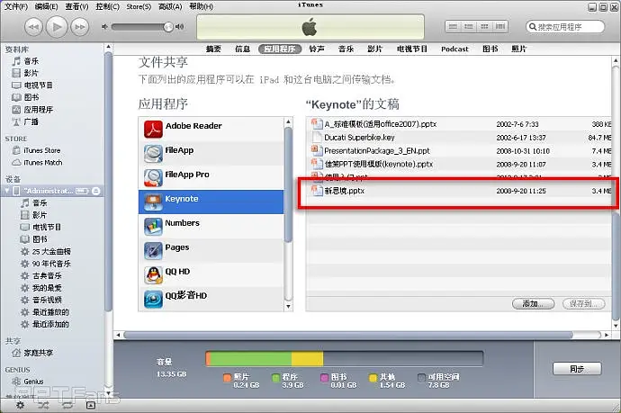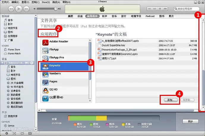 拉下itunes右方的滚动条,直到出现应用程序,找到keynote软件,在右边出现“keynote”的文稿,我们要把pptx文件上传到这里,点击右下角的“添加”按钮。