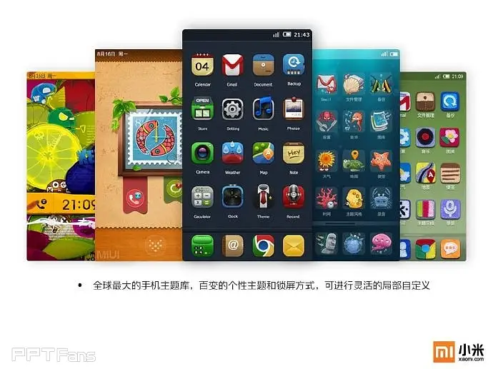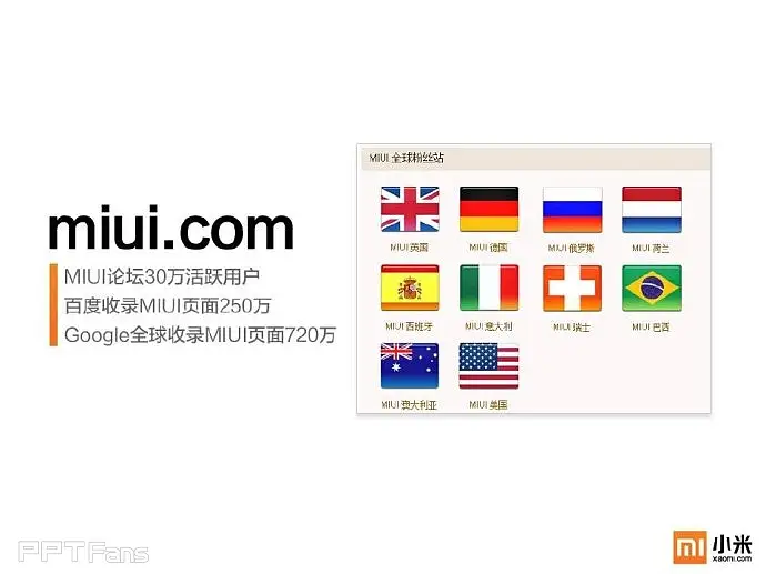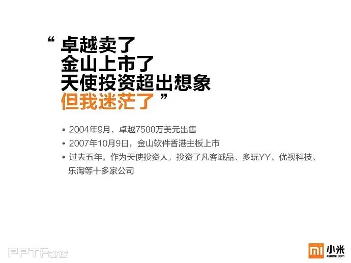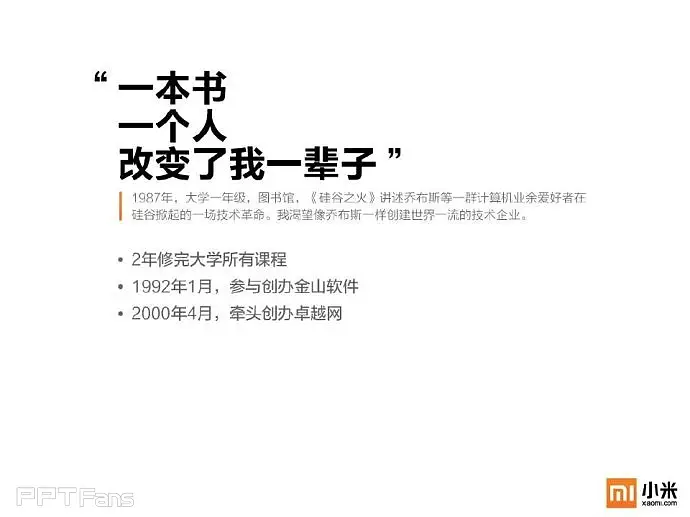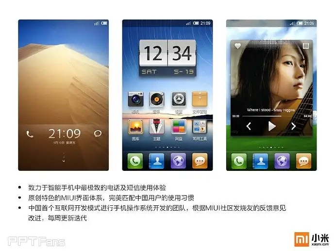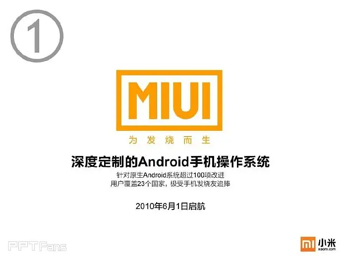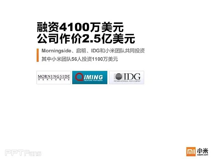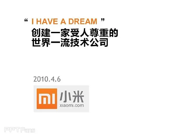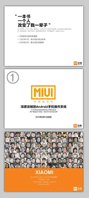 任何一个企业都必须要有自己的视觉识别系统及专属颜色,像可口可乐的红,百事可乐的蓝,小米手机也不例外——橙色。在对外展示的宣传物料中,包括PPT在内必须重复的强化这种颜色的视觉感受。