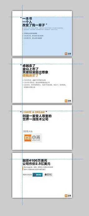 此PPT上有个核心骨架,版面依此骨架排列,使整体视觉统一,但切忌骨架四平八稳无变化,同样讲究画面留白,但最好不要上下左右边距一样(会显得比较呆板),大家仔细看雷军PPT的结构示意:蓝色部分就是整体版面骨架。
