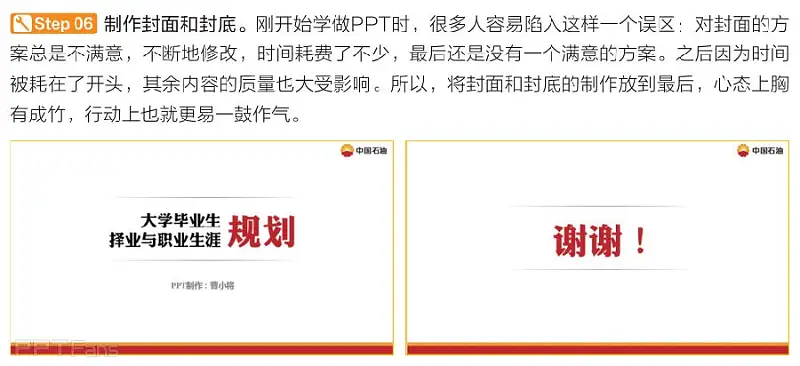 刚开始学做PPT时,很多人容易陷入这样一种情况:对封面的方案总是不满意,不断地修改,时间过去了,最后还没有一个满意的方案。之后因为时间被耗在了开头,其余内容质量也受影响。所以,而将封面放到最后,心态上胸有成竹,行动上也就更易一鼓作气。