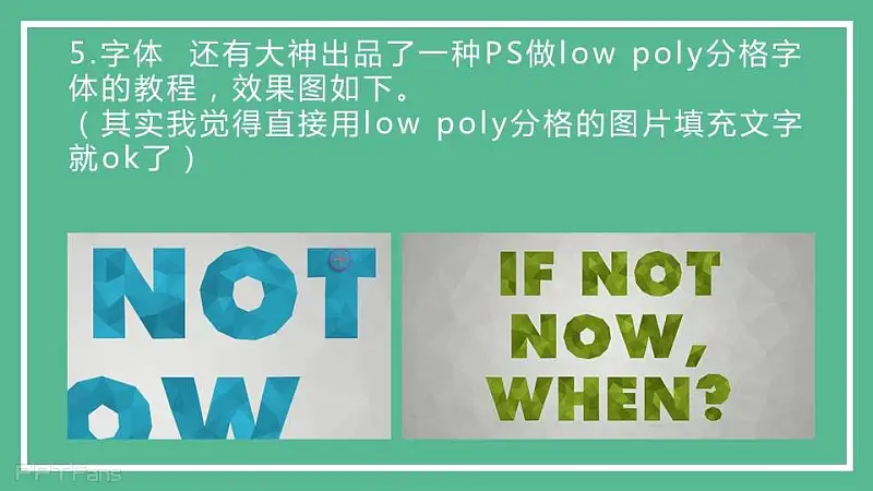 还有大神出品一种PS做Low poly分格字体的教程,效果图如PPT(其实我觉得直接用Low poly分格的图片填充文字就OK)