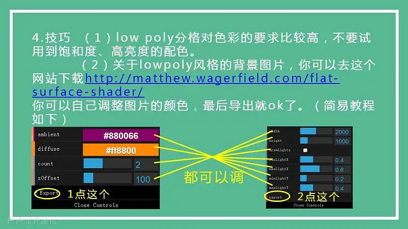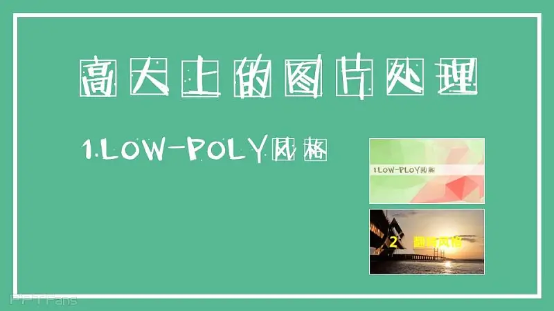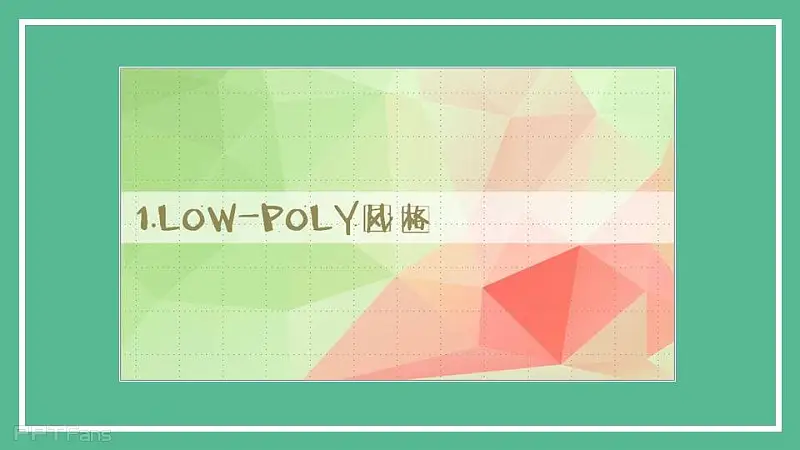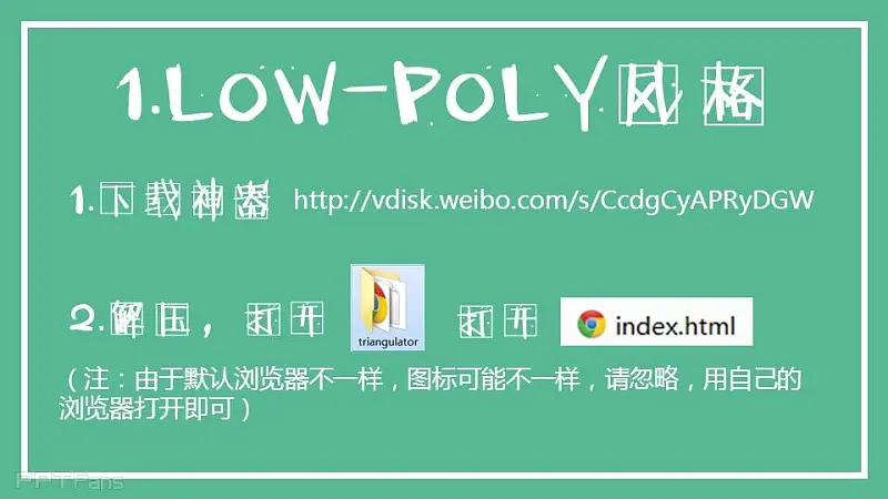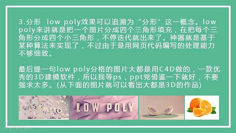 Low poly效果可以追溯为“分形”这一概念。Low poly来讲就是把一个图片分成四个三角形填充,把每个三角形分成四个小三角形,不停迭代就出来了。神器就是基于某种算法来实现的,不过由于用网页代码编写的处理能力不够细致。 最后一句Low poly分格的图片大都是用C4D做的,一款优秀的3D建模软件,所以我等PS,PPT党借鉴一下就好了。不要强求太多。(从PPT中看出,大都是3D作品)