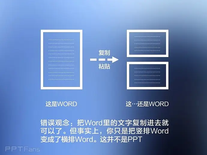 错误观念:把word文字复制进PPT里就可以了,但事实上,你只是把竖排的Word变成了横排Word,这并不是PPT。
