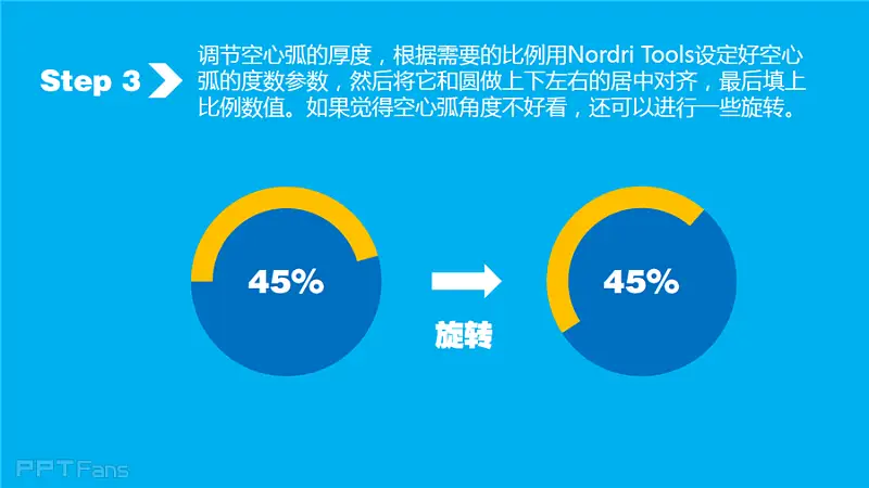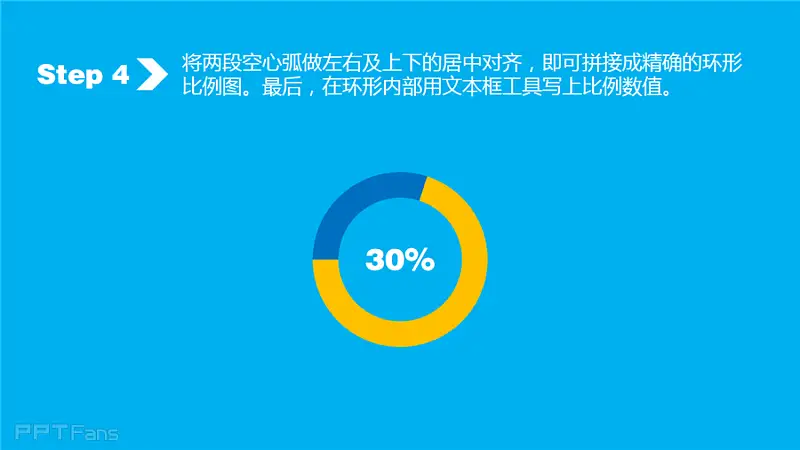 步骤4:将两段空心弧做左右及上下的居中对齐,即可拼接成精确的环形比例图。最后,在环形内部用文本框工具写上比例数值。