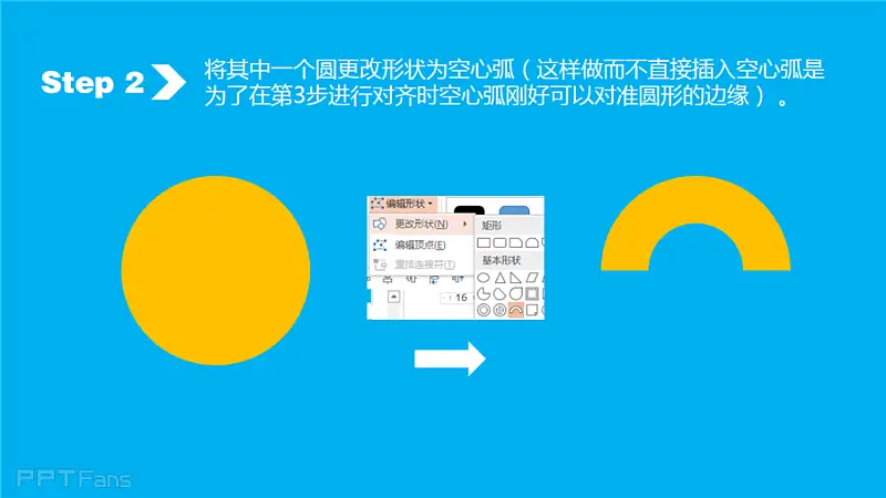 步骤2:将其中一个圆该形状为空心弧(这样做而不直接插入空心弧是为了第3步进行对齐空心弧刚好可以对准圆形的边缘)。