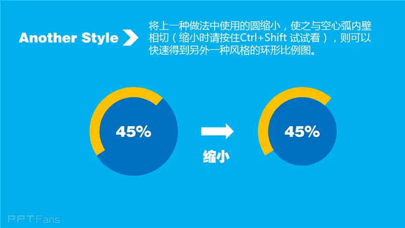 将上一中做法中使用的圆缩小,使之与空心弧内壁相切(缩小时请按住Ctrl+Shift试试看),则可以快速得到另外一种风格的环形比例图。