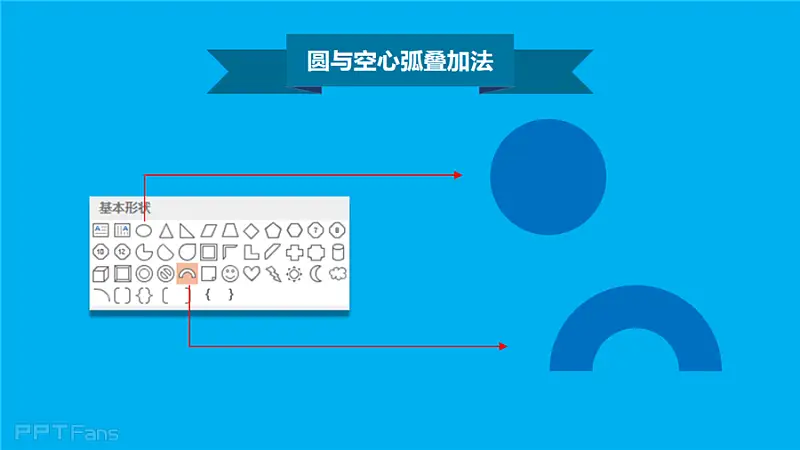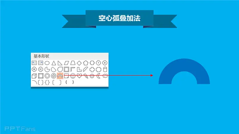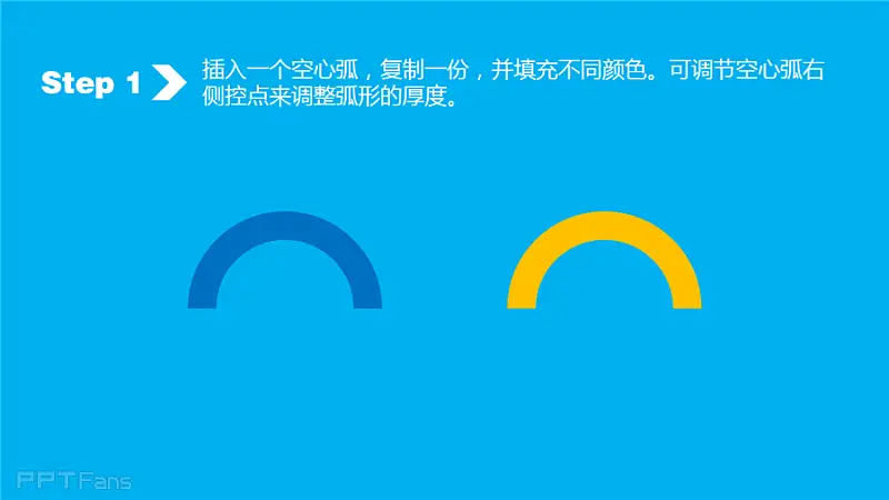 步骤1:插入一个空心弧形,复制一份,并填充不同颜色,可调节空心弧右侧控点来调整弧形的厚度。