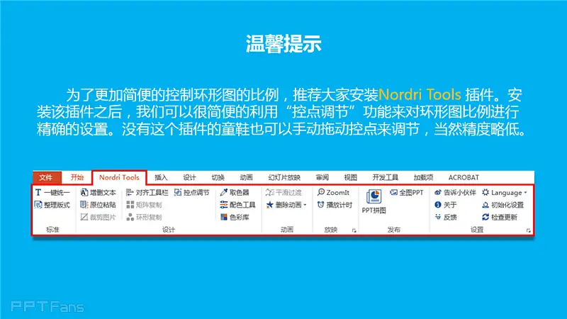 为了更加简便的控制环形图的比例,推荐大家安装Nordri Tools插件。安装该插件之后,我们可以很简便的利用"控点调节"功能,来对环形图比例进行精确的设置,没有这个插件的童鞋也可以手动拖动控点来调节,当然精度略低。