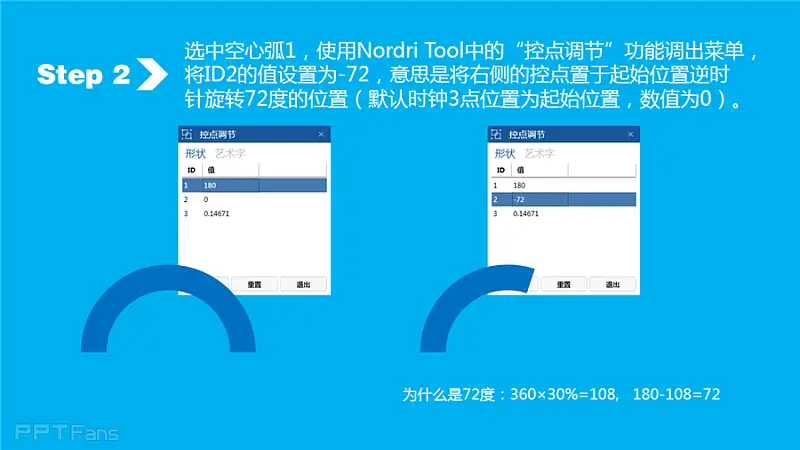 步骤2:选中空心弧1,使用Nordri Tool中的“控点调节”功能调出菜单,将ID2的值设置为-72,意思是将右侧的控点置于起始位置逆时针旋转72度的位置(默认时钟3点位置为起始位置,数值为0)。