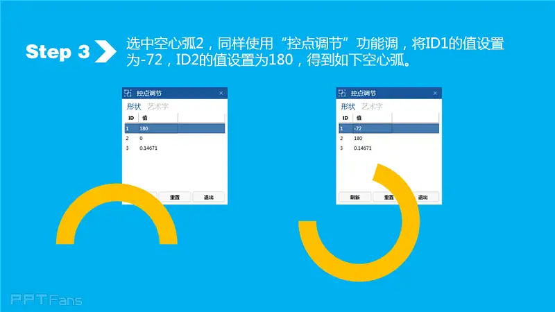 步骤3:选中空心弧2,同样使用“控点调节”功能,将ID1的值设置为-72,ID2的值设置为180,得到如下空心弧。