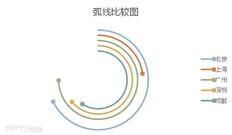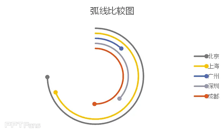 前几天,看到秋叶在微博上转发小伙伴们交的作业,做一种类似下图的弧线式比较图表。为了实现弧线尾端的圆点效果,所使用的方法是做圆环图-选择性粘贴为图形-取消组合为形状-编辑顶点-删除顶点成为弧线-设置尾端圆点。看到那些小伙伴那么有耐心地编辑顶点、删除顶点,我在想,要是数据变化了他们怎么办啊?!因此,就有了这篇日志。