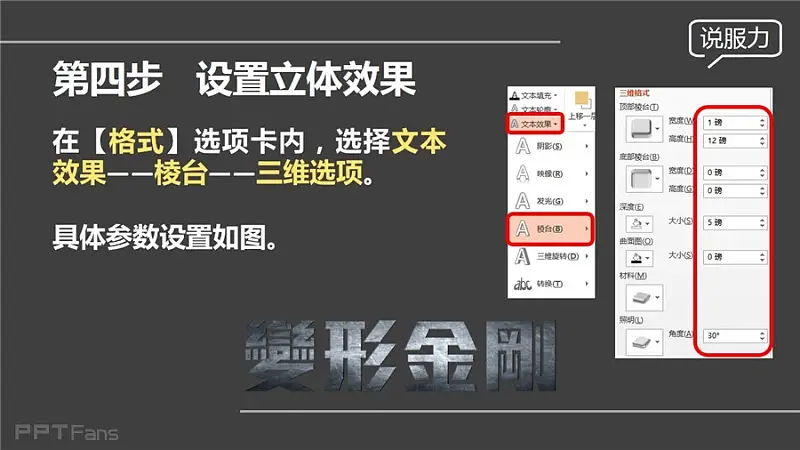 在【格式】选项卡内,选择【文本效果】-【棱台】-【 三维选项】。具体参数设置如图示