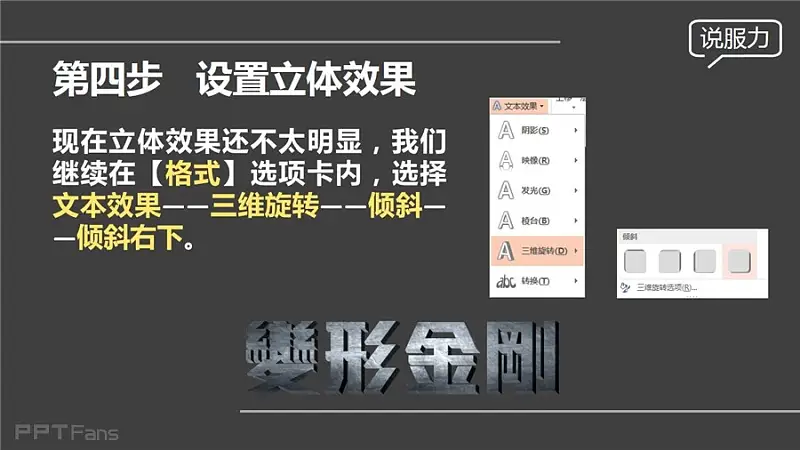 现在立体效果还不太明显, 我们继续在【格式】选项卡内,选择【文本效果】-【三维旋转】-【倾斜】-【倾斜右下】。