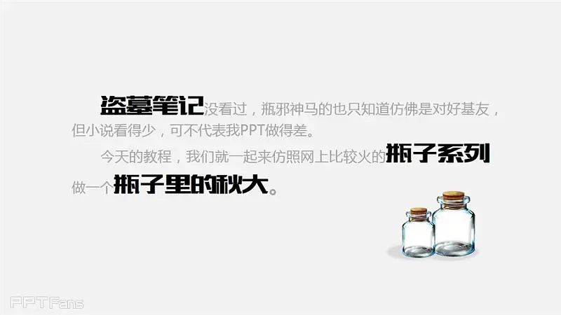 盗墓笔记没看过,瓶邪神马的也只知道仿佛是对好基友,但小说看得少,可不代表我做PPT做的差。今天教程我们一起来仿照网上比较火的“瓶子系列”做一个瓶子里的秋大。