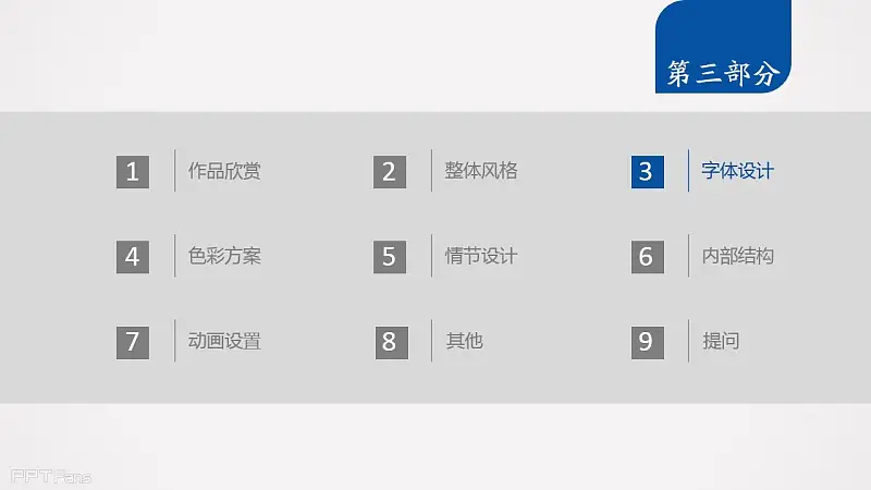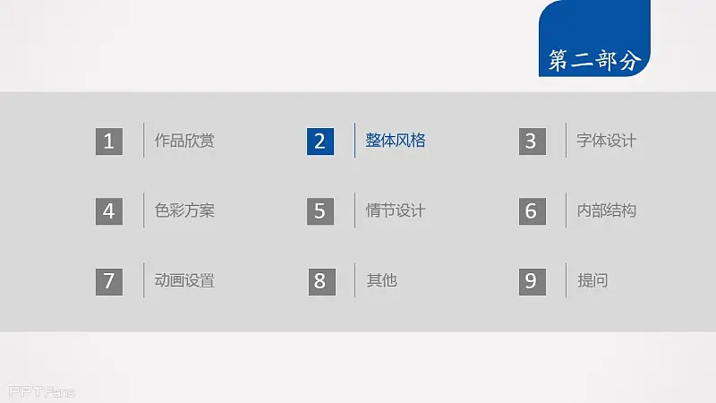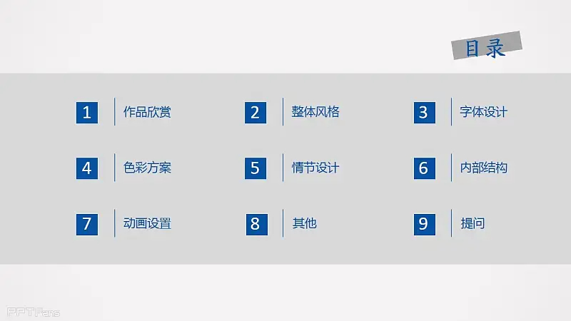 01.作品欣赏 02.整体风格 03.字体设计 04.色彩方案 05.情节设计 06.内部结构 07.动画设计 08.其他 09.提问