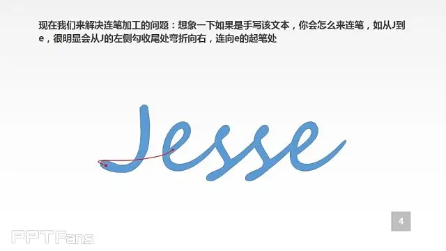 现在我们来解决连笔加工的问题:想象下如果是手写改文字,你会怎么来连笔,如从J到E,很明显会从J的左侧勾收尾处弯折后,连向E的起笔处。