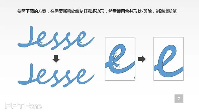 参照下图的方案,在需要断笔处绘制任意多边形,然后使用合并形状-剪除,制造出断笔。