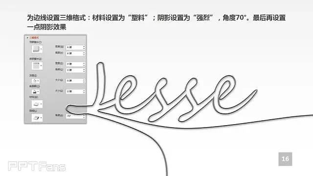 为边线设置三维格式:材料设置为“塑料”;阴影设置为“强烈”,角度70°。最后再设置一点阴影效果。