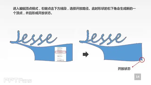 进入编辑顶点模式,右键点击下方线段,选择开放路径。此时形状的右下角会生成新的一个顶点,并且形成开放状态。