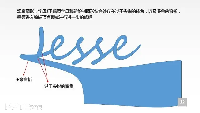 观察图形,字母J下端原字母和新绘制图形结合处存在过于尖锐的转角,以及多余的弯折,需要进入编辑顶点模式进一步修缮。