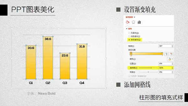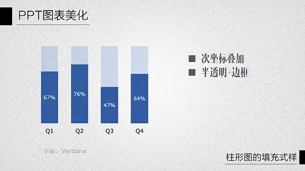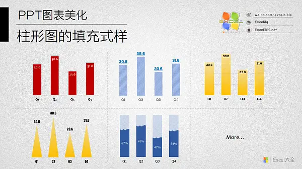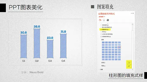PPT的使用场景以及版式风格的不同,图表的式样也会有不同的美化方向。在这一节中会给大家推荐一些比较通用的柱形图填充式样类型,抛砖引玉供大家参考。