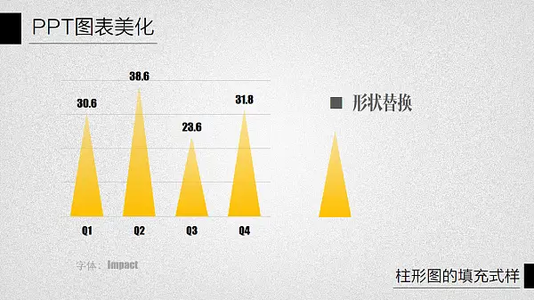 对于柱形图来说,比较常见的图形替换方式有常规形状替换(三角形、梯形)或具象化替换(以实物的具体图标进行替换)。例如上面图中的例子就是以一个半透明渐变方式填充的(半透明渐变设置方法参考第2点)等腰三角形形状进行替换。