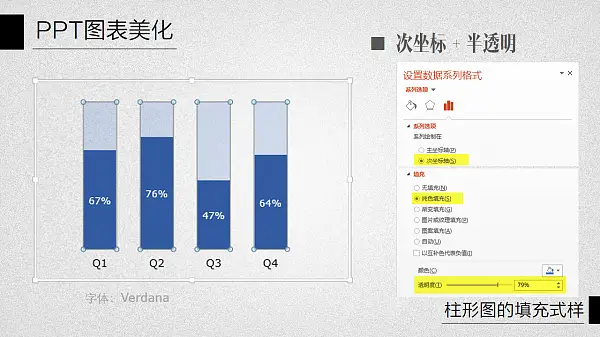 接下来,选中代表100%的这组数据系列,设置填充色的透明度为半透明(70%以上),再添加边框,即可呈现效果。另一组柱形数据系列不需要进行太多设置,尽量选择深色配色,与背景色形成反差。横坐标轴同样可以隐藏。