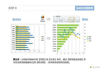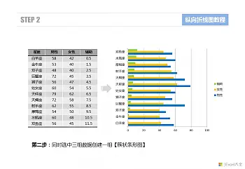 在图表中选中辅助数据以外的另外两个系列(在本例中分别是【男性】数据系列和【女性】数据系列),在选中单个系列的情况下通过【更改图表类型】功能改为包含直线和数据标记的【散点图】。这个步骤的操作结果是形成一张组合图表,其中的【男性】和【女性】系列是散点图,而【辅助】系列则是最开始的条形图。这个组合图的生成关键就是需要在图表中单独选中某个系列的情况下来更改图表类型,如果选中的是整张图表,那将会改变整个图表的类型。