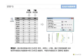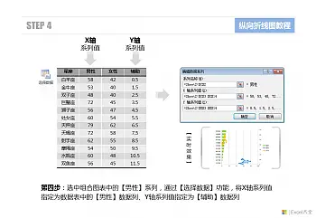 由于更改了图表类型,散点图需要使用两组数据来进行绘制,而原有的系列当中只包含了一组数据,因此在这里需要为两个散点图系列重新指定数据源。分别选中图表中的【男性】系列和【女性】系列,通过【选择数据】功能,将X轴数据指定为原有的数据列,而将Y轴数据指定为【辅助】列数据。