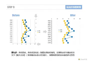 步骤9:最后一步可以对图表进行一些美化设置。可以隐藏右侧的坐标轴线(线型设置为无线条、轴标签设置为无);左侧纵坐标与横坐标的交叉位置设置在【最大值】,这样可以将横轴及其轴标签显示在图表上方;另外还可以设置网格线和轴线间隔以及颜色等等。