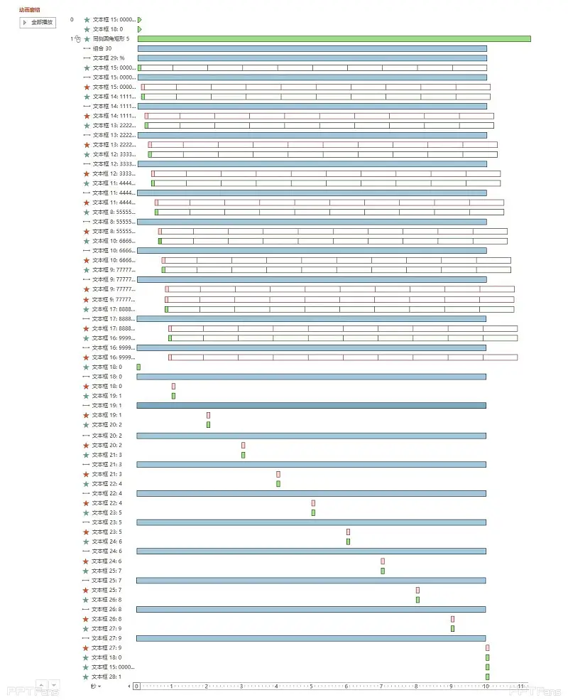 以往ppt中的数据都是死的,直接摆上去,那么怎样实现数据的变化,看到数据的增长过程呢?比如数据从00%以1%为单位变化到100%。一遇到这个问题,首先想到的是文本中单个字符变化,那一定要用到的是动画文本按字母发送而且也是制作的主要方法。然后既然是变化的必然有进入和退出动画,那应该用哪个呢?方法是按字母发送那就不能用瞬间动画,于是直接排除出现和消失,选择了淡入淡出。然后考虑时间线,数据从0-100%按个位数变化,以0.1s为例,个位数字1有0.1秒的时间出现,个位数字2在下一个0.1s出现,同时个位数字1不显示……以此类推,到1.0s时个位数字1再次出现,同时十位数字出现1……就这样循环。即个位数字1出现的时刻为:0.0,1.0,2.0,3.0……每次出现持续时间0.1s,同理个位数字2出现的时刻为:0.1,1.1,2.1,3.1……每次出现持续时间同样为0.1s。