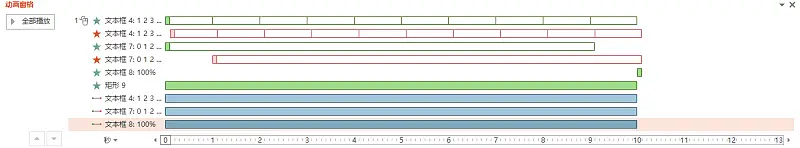 初步尝试,先准备了10个文本分别填入:“000000000”,“1111111111”,“222222222”……“999999999”。一个文本代表一个个位数字,之所以要是个字符为一个文本是为了保证发送时间为动画时间10倍,将后面的9个字符设置无色,那么能看到的就是第一个字符,实际上后面9个一直有变化只是你看不到,起到的是占位的作用。每组动画(进入和退出)重复10次,然后按顺序,每个文本的动画与上以文本延迟为单个字符动画的时间,这里为0.1s。这样可以看到就可以完成个位数的变化了。十位数就很简单了单个数字持续时间是个位数单个数字时间的10倍,淡出后设置10倍的延迟时间即可.最后放到一起,添加百位的1和%就完工了。