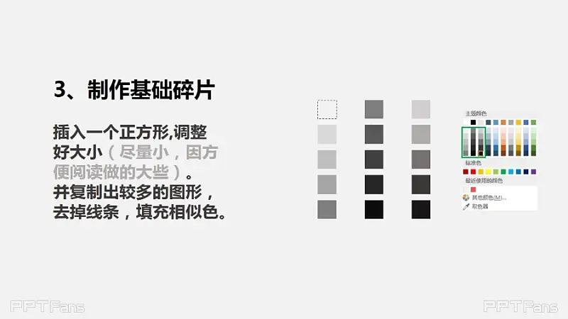 插入一个正方形,调整好大小,并复制出较多的图形,去掉线条,填充其相似色。