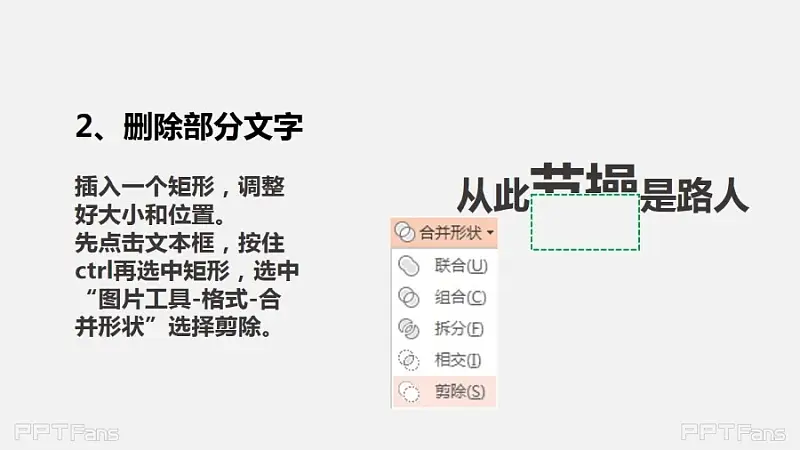 插入一个矩形,调整好大小和位置。先点击文本框, 按住ctrl再选中矩形,选中“图片工具-格式-合并形状”选择剪除。