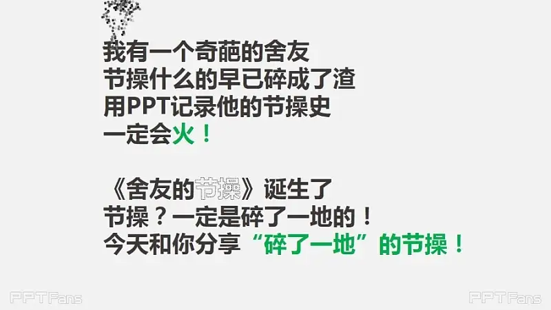 学完本PPT教程,从此节操是路人——教你做“碎了一地”效果。 我有一个奇葩的舍友,节操什么的早已碎成渣,用PPT记录他的节操史,一定会火!《舍友的节操》诞生...