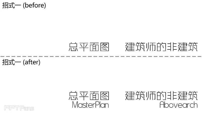 解读:很多童鞋觉得用英文排版好看,为什么呢?因为英文字母构成简单,灵活多变,总而言之具有图形感,所以第一招就是双语编排,尤其是标题和重要段落(比如文本扉页、文本/展板的固定格式部分,通常为项目名称)。