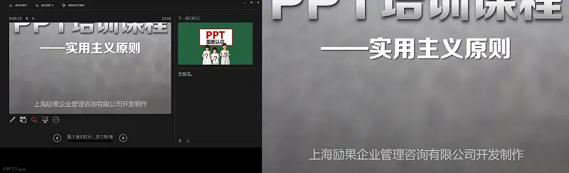powerpoint2013放映界面主体部分分为3大块,当前放映页、下一张幻灯片预告和备注页(这里是两个屏幕的截图,左边部分为电脑上的屏幕,右边部分为投影仪打在画布上的效果),这样一来可以看到备注,提示这张幻灯片的主要讲解思路,二来还能知道下一张幻灯片要讲什么,此发明,要赞!!!