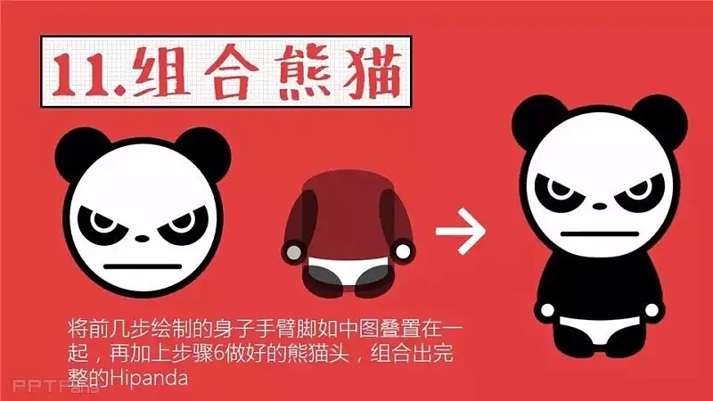 第一步:熊猫脸;第二步:熊猫耳朵;第三 步:熊猫眼睛;第四步:愤怒熊猫眼;第五步:熊猫头(上);第六步:熊猫头(下);第七步:熊猫身子;第八步:熊猫内裤;第九步:熊猫手臂;第十步:熊猫脚;第十一步:熊猫组合。