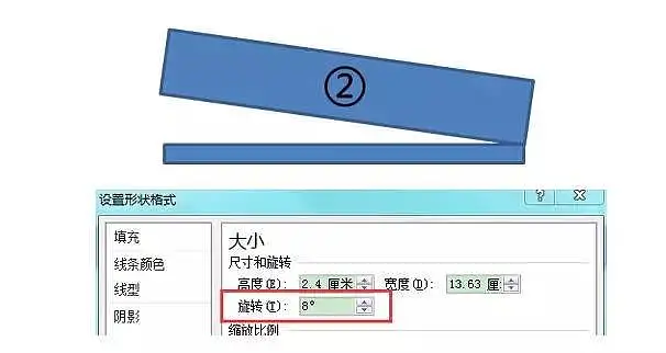 Tips:为了方便顶点编辑,可以先多画一个矩形2,作为顶点编辑的参照。点击格式→旋转→其他旋转选项,按下图设置参数,旋转矩形2。