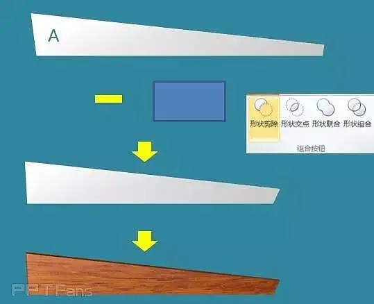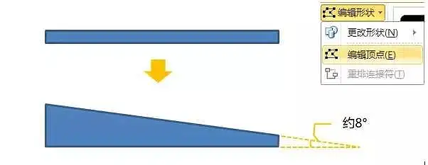 1、我们从原教程的步骤10开始。和原教程一样,首先我们画一个细长的矩形,然后点击格式→编辑形状中选择顶点编辑,把它拉成一个直角梯形。