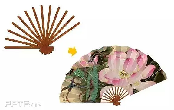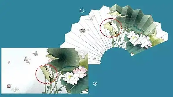 这个问题比较简单,只要调整形状B的长度(后面的新教程会详细介绍步骤),就可以解决了,可是这样一来形状A和B的实际大小就不同了。在此调整的基础上继续按照原教程制作,当按照原教程步骤13对扇面形状进行填充后,得到下图1。这时将上图1和扇面原图片(下图2)比较后发现,填充以后褶皱处出现了图片内容对不上的情况,也就是图片失真了,出现了新的的问题。