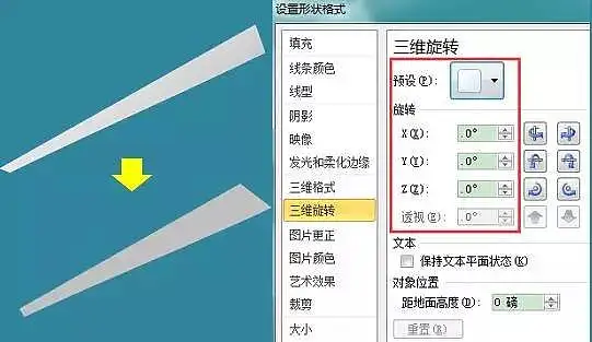 15、选中步骤14的结果并单击右键,选择设置形状格式→三维旋转,将之前设置的三维旋转“前透视”改为无旋转,其他三维旋转参数全部改为0。