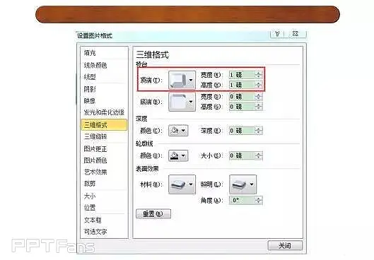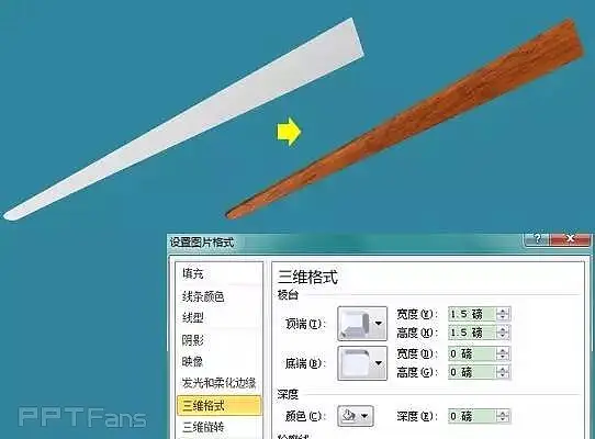 12、继续右键点击扇骨形状,选择设置形状格式→三维格式,设置形状的顶端棱台为“角度”,调整合适的参数(图中数据仅供参考),得到下图。