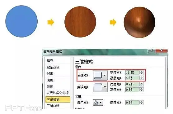 19、按住shift键,画一个适当大小的圆形,作为扇骨的螺丝帽,按照前述扇骨的制作方法进行木纹图片填充,轮廓线为无轮廓,设置三维棱台为圆,调整参数得到下图结果(图中参数仅供参考)。