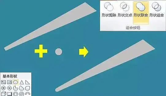 16、按住shift键,画一个适当大小的圆形,按住Ctrl键选中它和步骤15的结果,进行形状联合,完成扇骨底部的弧度造型。