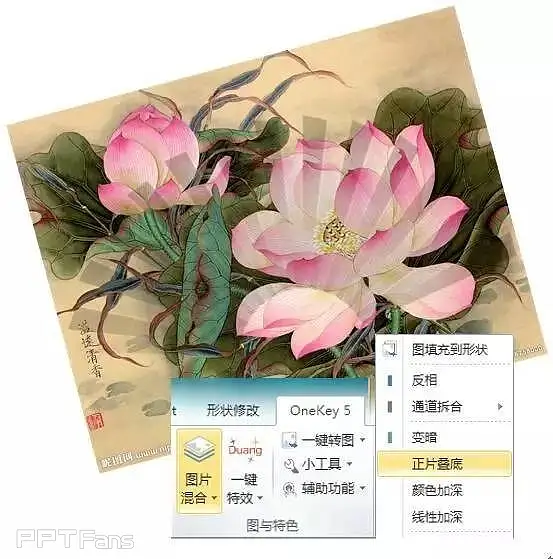 8、按住Ctrl键同时选择上图中的图片1和图片2,用OK插件的图片混合工具合成。点击OneKey5标签→图片混合,选择正片叠底,出现下图效果。注意操作之前的叠放次序,图1在上,图2在下,不可错,否则插入的图片和最终做出的扇面就分不开了。