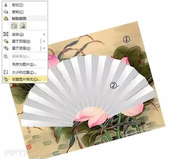 找一张图片作为扇面填充图片,它可以是网上下载的图片、你自己制作的图片等,我找的是一张荷花图(如上图),然后将图片插入,选中它点击右键→设置图片格式→大小,按之前调整形状的方法调整图片的大小和角度。