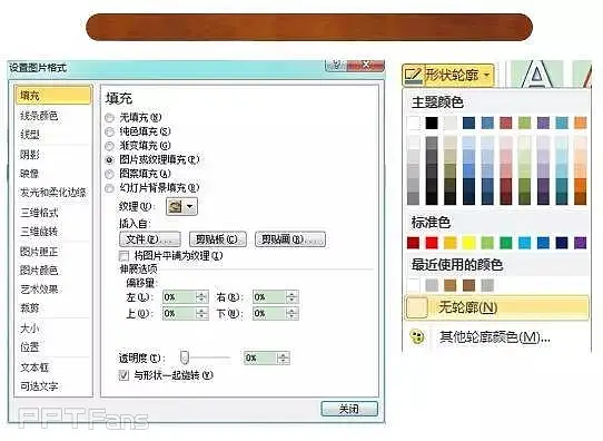选择刚才的圆角矩形,点击格式→形状填充→图片…,在弹窗中选择刚才下载的木纹图片进行填充。可以右键点击扇骨形状,选择设置形状格式→填充,在弹窗中微调填充图片的各种参数。最后将形状轮廓设置为无轮廓,得到下图的样子。