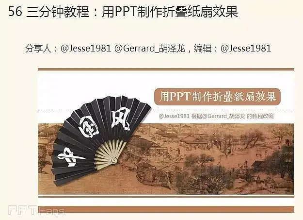 我通过《秋叶PPT-三分钟教程-003期》,学习了《56 三分钟教程:用PPT制作折叠纸扇效果》这一课,做出的扇子很漂亮,但是,也从其中发现了问题。通过不断尝试后,我对原教程进行了修改,用新的方法解决了问题。下面将详细介绍出现的问题和新教程。