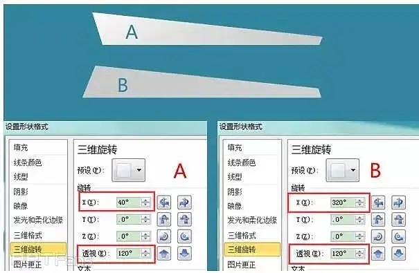 3、和原教程步骤11一样,将2的结果复制两份,设置格式→形状效果→三维旋转→前透视,再按下图参数设置好三维旋转选项,生成形状A和B。